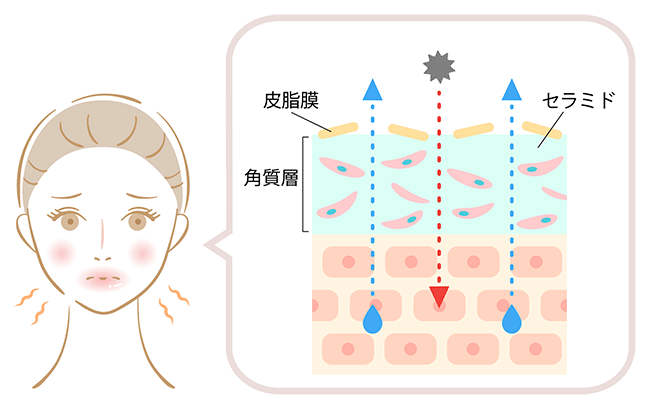 私たちの肌の表面は表皮と呼ばれ、その一番表面に近い部分を角質層といいます。その細胞の間を埋めているセラミドなどの脂質が、内側の水分が蒸発するのを防ぎながら、外側の刺激から肌を守っています。この働きはバリア機能と呼ばれます。