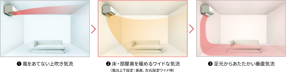 垂直気流に切り換わり足元からあたためます。