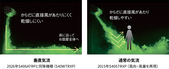*画像は、試験のため煙とレーザー光線を用いて気流を可視化したものです。室温安定時、2026年S406ATRPと同等機種(S40WTRXP)、風量「自動」温湿度環境や家具・カーテンレール等、設置状況によっては試験画像のような気流にならない場合があります。