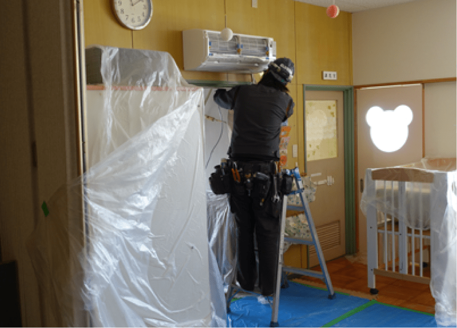 昨年の冬に保育室を改築し、隣接していた職員室の一部を保育室に増築しました。保育室と職員室でエアコンを使用していましたが、増築後に効きが悪いと感じ始めていたところ、今年2月頃に職員室のエアコンが完全に停止してしまいました。
