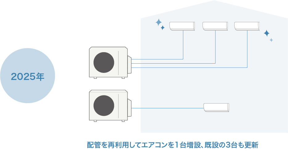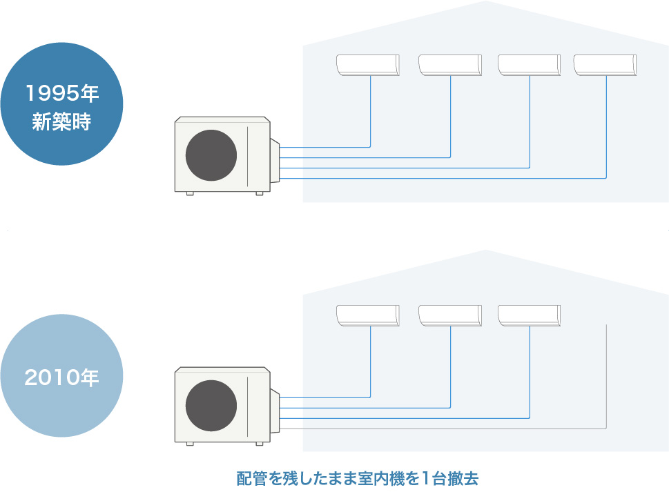 2010年には、子どもの自立に合わせて、室内機台数を1台減らした3室タイプのマルチエアコンに入れ替えました。
