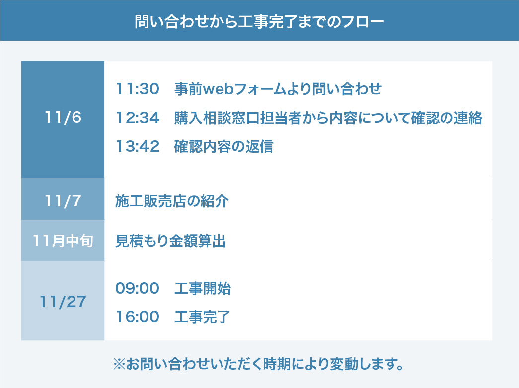 問い合わせ後は、数回のやり取りのみで確認が終わり、翌日には販売施工会社の紹介してもらいました。