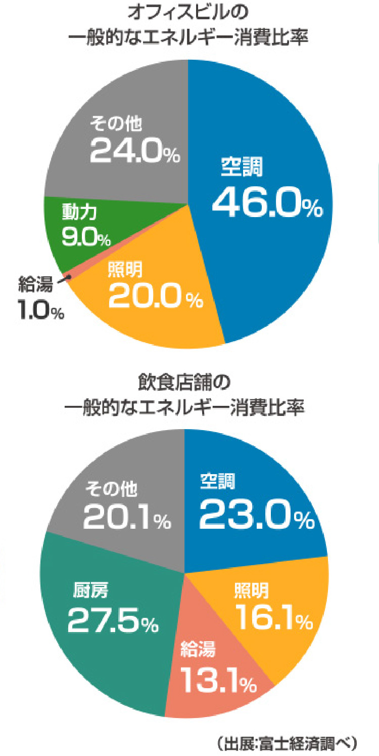 実はオフィスでも店舗でも、エアコンは消費電力全体の約 1/2~1/4 とかなり大きな割合を占めています。