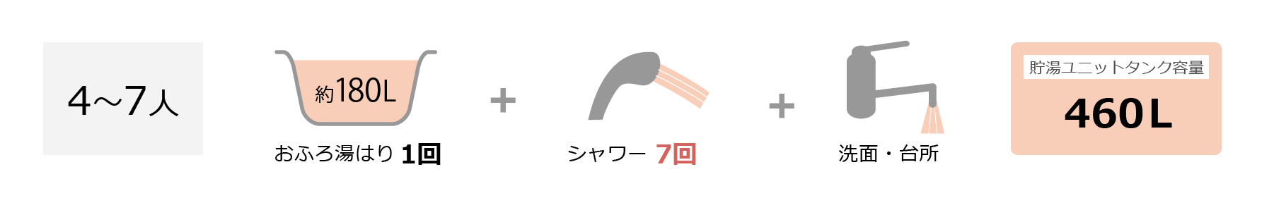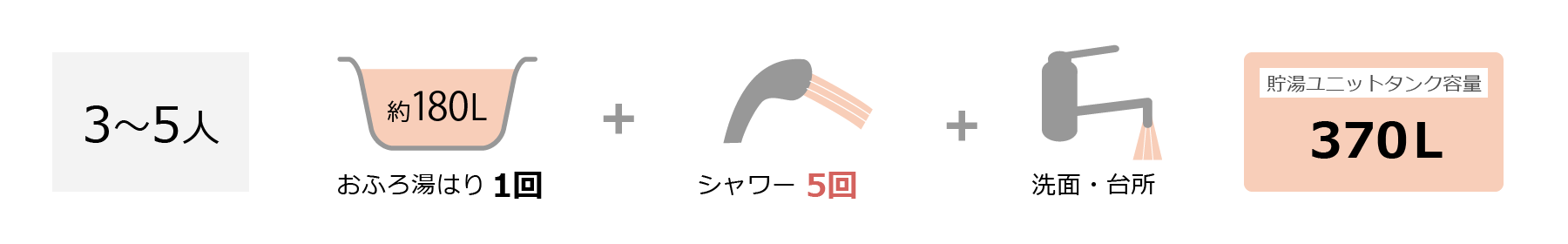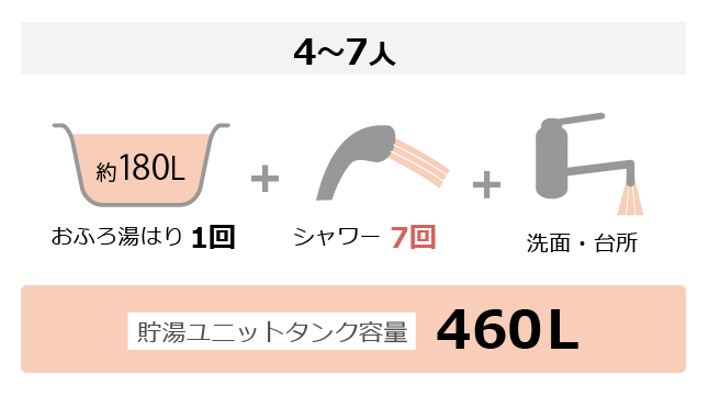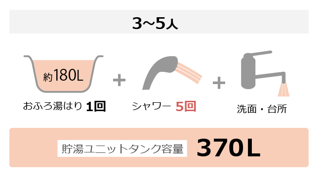 適切なタンク容量を選ばなければ、湯切れを起こしかねません。タンク容量は、基本的には家族人数から選定します。目安は、3~5人で370L、4~7人で460Lです。ただし、実際の使用量や今後の家族人数の増減予定なども考慮して検討する必要があります。