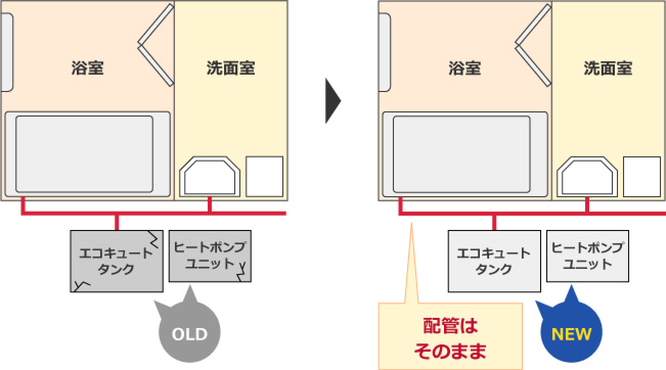 給湯器の既存の配管が利用できない、もしくは給湯器の設置場所を変更する場合には新設します。そのまま配管を再利用できることもあります。