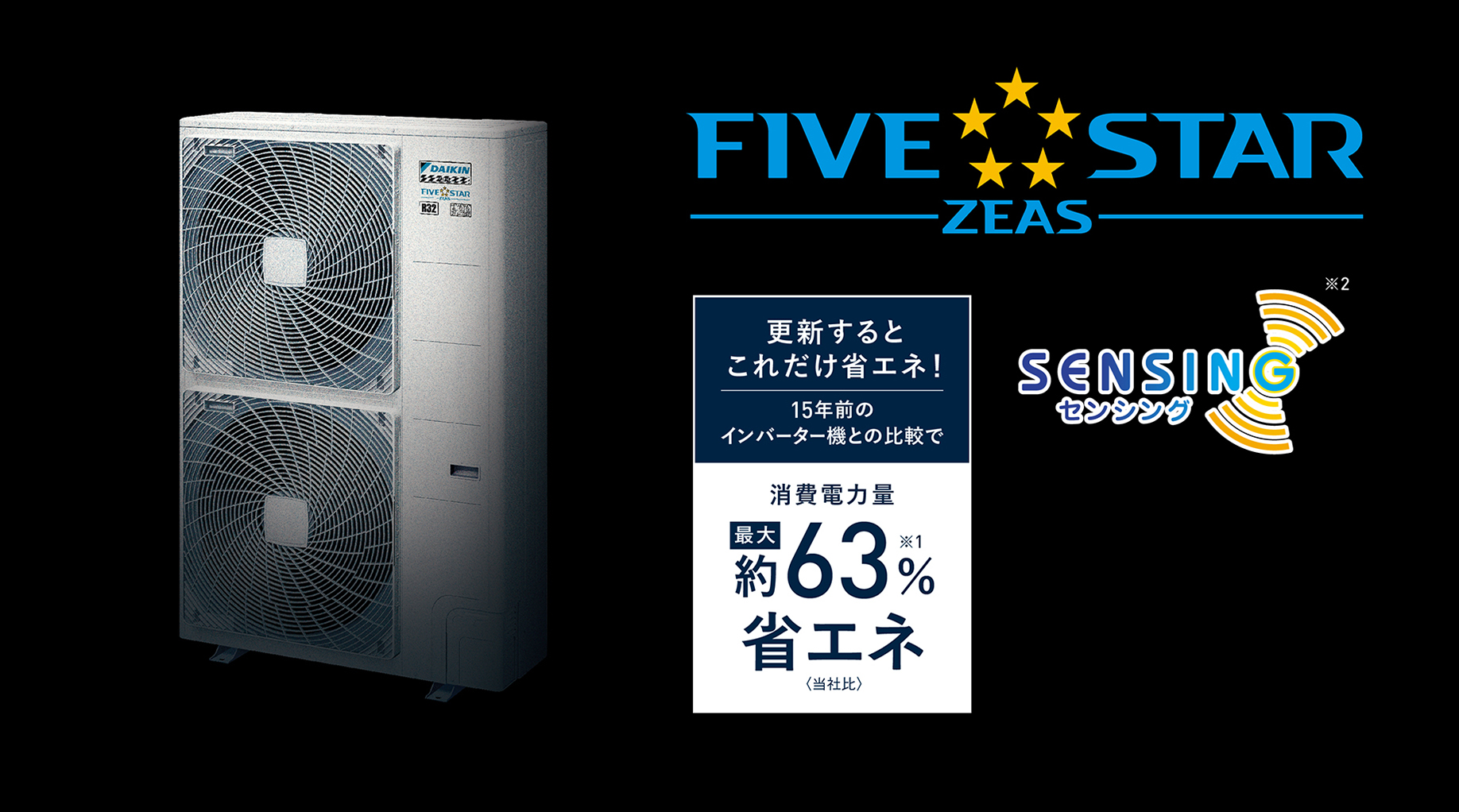 ダイキンの省エネタイプの店舗オフィス用エアコンFIVE STAR ZEASでは、機器のハード面での省エネ設計に加えて、センシング機能や制御技術で、快適でありながら節電に貢献する機能が搭載されています。そのため標準タイプと比べて電気代を抑えられます。