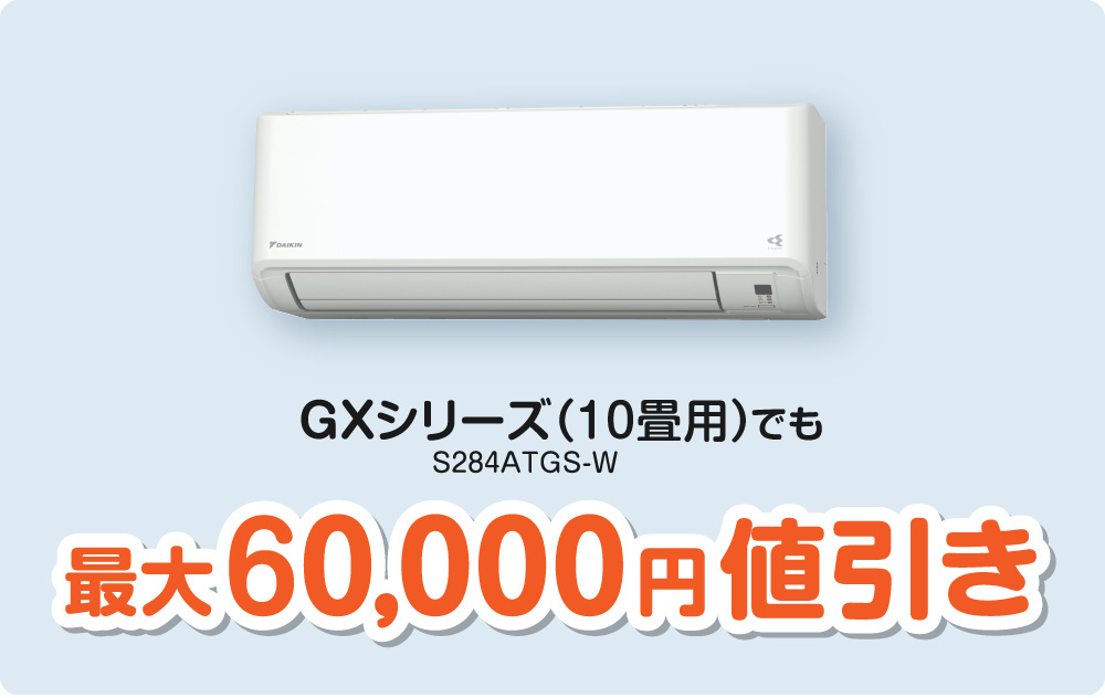 うるさらX(例:S405ATRP-W)やAXシリーズ(例:S405ATAP-W)がお得に購入できるのはもちろん、GXシリーズ(例:S284ATGS-W)も機種によっては最大60,000ポイント分のお値引きの対象製品です。お得に省エネ性の高いエアコンの導入ができます。