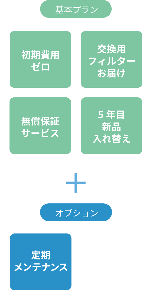 本サービスは、初期費用不要な上、設置から梱包材の廃棄まですべて無償となります。オプションの定期メンテナンス契約であれば、面倒なフィルター交換や本体の清掃をすべてお任せいただけます。
