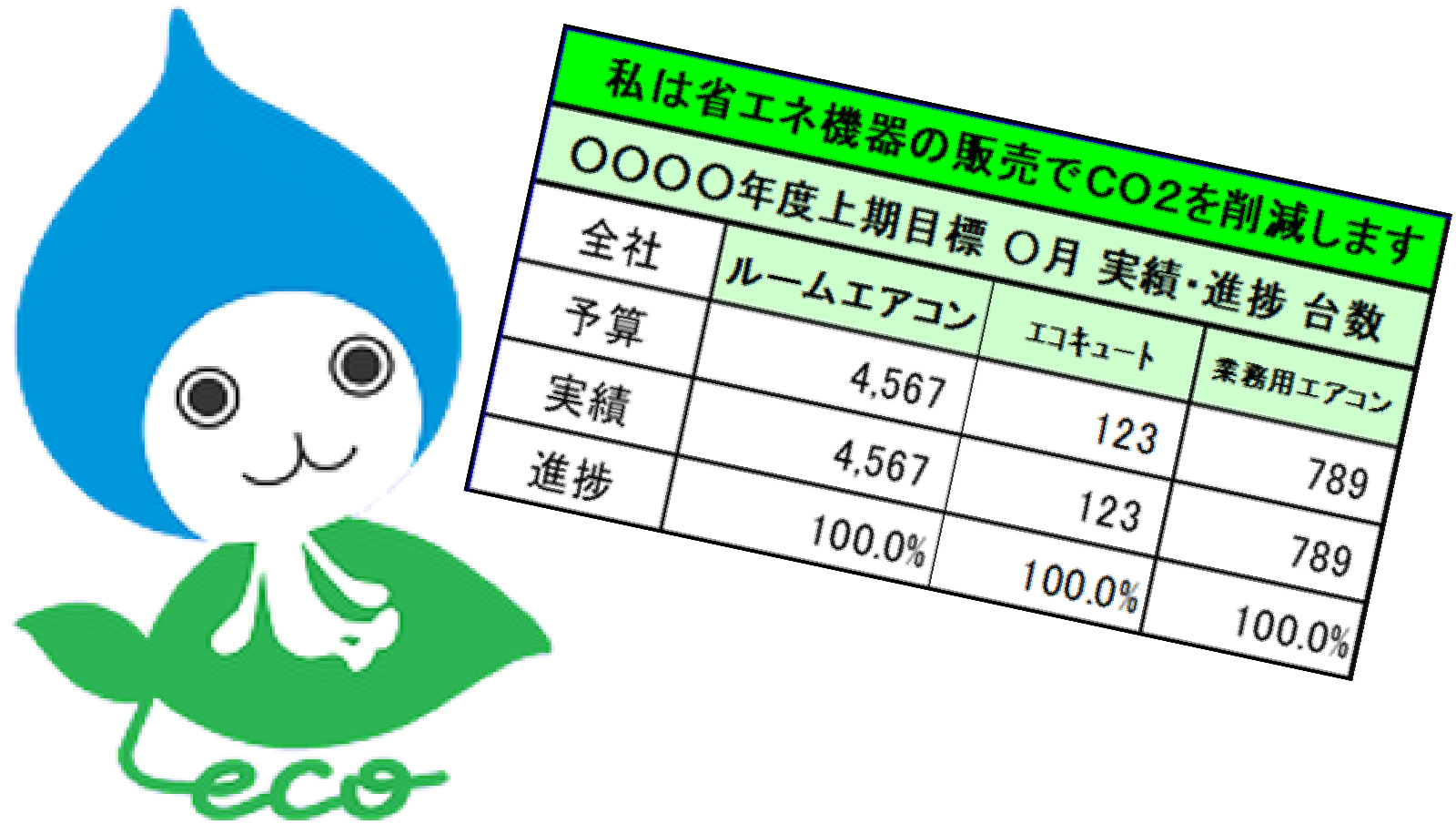 カードは営業社員全員に配布をしていて、各自の販売目標・実績と販売数に対するCO2削減量が一目で分かるようになっています。