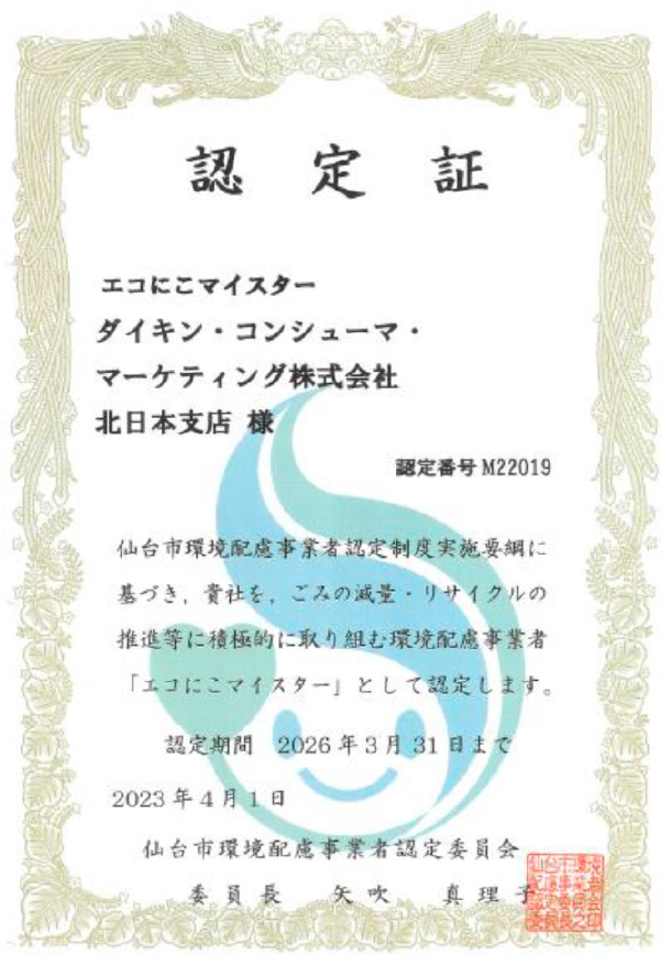 北日本支店では、毎年の環境取り組みを市に報告し、「エコにこマイスター」の認定を受けています。