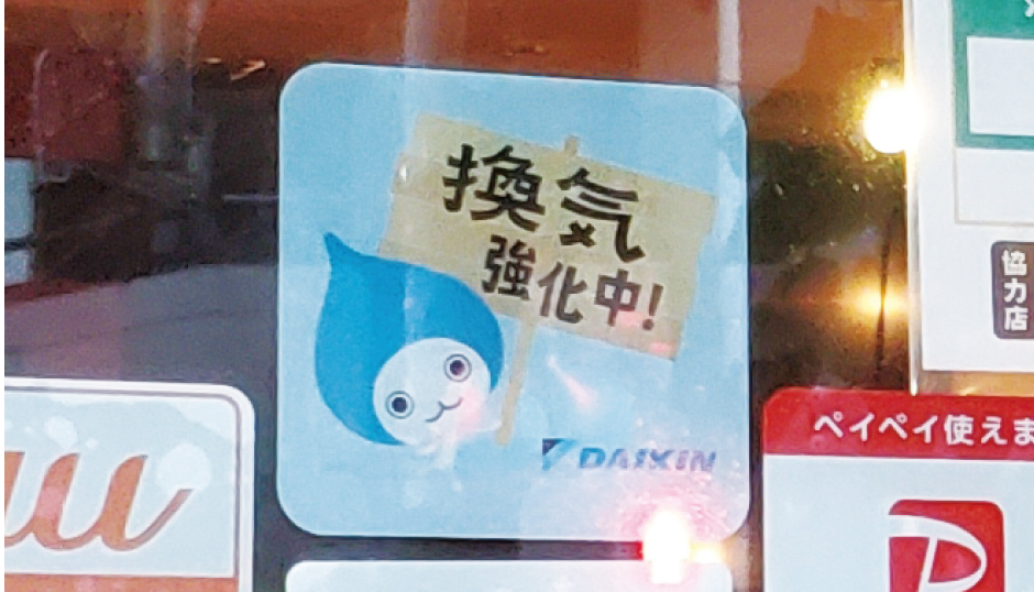 お店の換気対策をさらにPRいただくため、ぴちょんくん「換気強化中!」シールを、入口付近の窓と排気口側の2ヶ所に貼っていただきました。