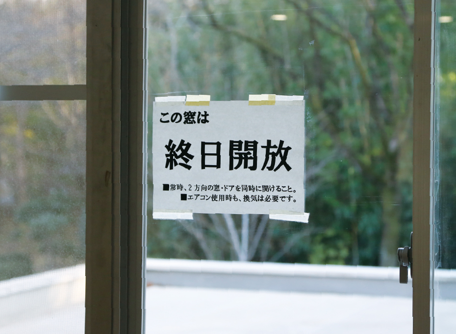 みんなが集まる場所には「この窓は終日開放」ポスターで換気を推進。