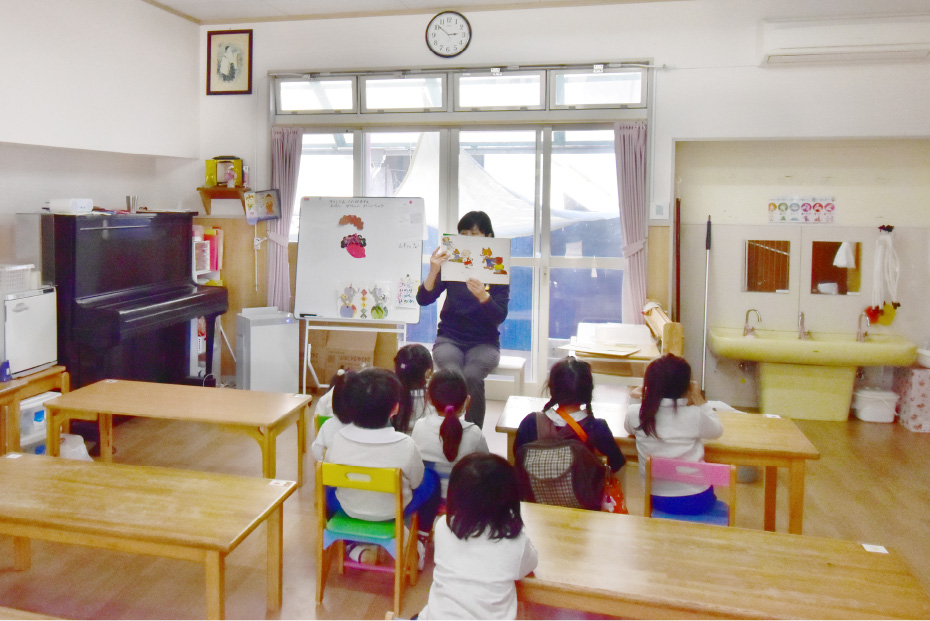 コロナウイルスの流行により、1箇所に集まらず各部屋に分かれた“分散型保育”を行なっていました。以前は、全クラスの園児が遊戯室という広めのホールに一堂に集まり、誕生日会などの行事をしていましたが、コロナ最盛期には1つのクラスだけがホールに集まってお祝いし、その様子を他のクラスへZoom配信を行なっていました。