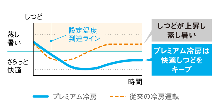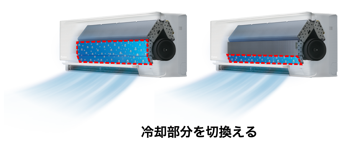 設定温度に達したあとも熱交換器の冷却部分を無段階に切換えて除湿を行い、蒸し暑さを感じにくい快適な冷房を実現。