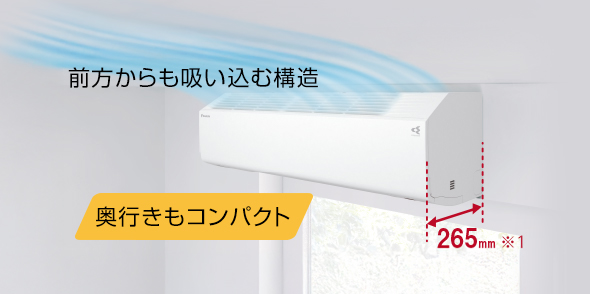 高さ250mmサイズの「フィルター自動お掃除」機能搭載エアコンでありながら、本体上部をカットした「ナナメカット」形状で吸い込みの効率化をはかり、奥行きも265mmに抑えました。