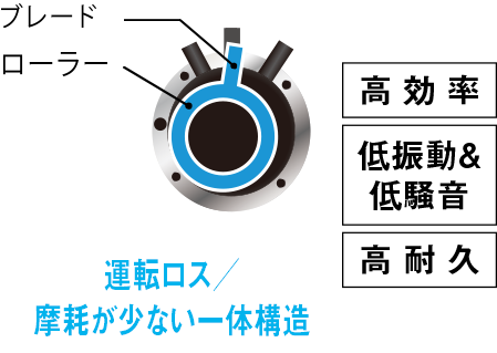 エアコンの性能を左右する心臓部・コンプレッサーは、なめらかな動きでエネルギーをムダにしない、高効率運転を行います。