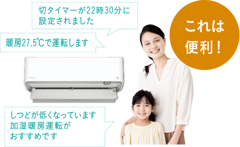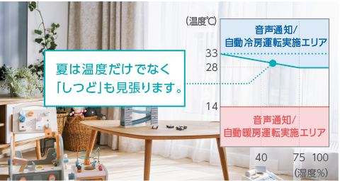室内が高温または低温になりすぎるとエアコンのセンサーが検知して音声でお知らせ。さらに自動で冷房・暖房運転を行います。