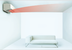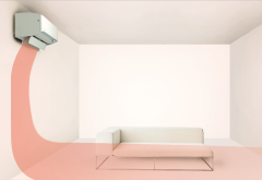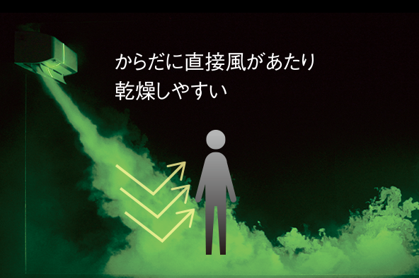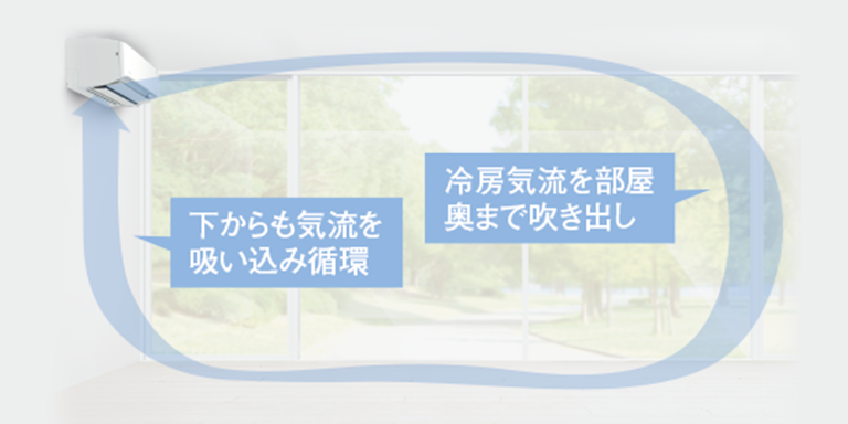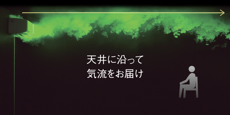 *画像は、試験のため煙とレーザー光線を用いて気流を可視化したものです。室温安定時、2025年S405ATRPと同等機種(S40WTRXP)、風量「自動」温湿度環境や家具・カーテンレール等、設置状況によっては試験画像のような気流にならない場合があります。