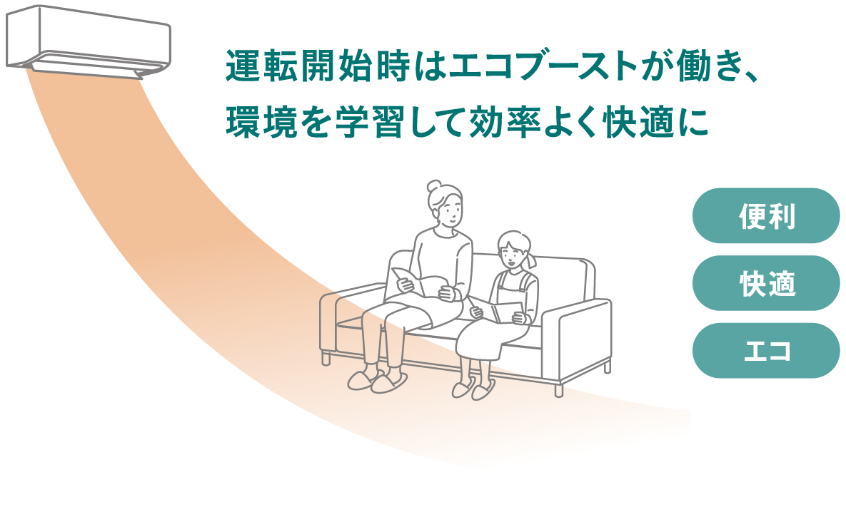 ※1. 当社測定基準による評価。当社環境試験室(14畳)において。測定機S406ATRPにおいて:学習あり、学習なしとの比較。【冷房時】測定条件:外気温35℃、設定温度27℃、風向3段階目、風量自動。設定温度に到達し運転が安定したときの消費電力量で比較。 試験結果:学習あり333Wh 学習なし351Wh【 暖房時】測定条件:外気温7℃、設定温度20℃、風向3段階目、風量自動。設定温度に到達し運転が安定したときの消費電力量で比較。 試験結果:学習あり492Wh 学習なし536Wh ●実使用環境により効果は異なります。