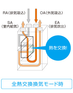 RA(排気吸込)の空気の熱を、超薄膜型エレメントを通して給気に伝えます。その結果温度ムラが抑えられ、室内が快適な温度に近づきます。