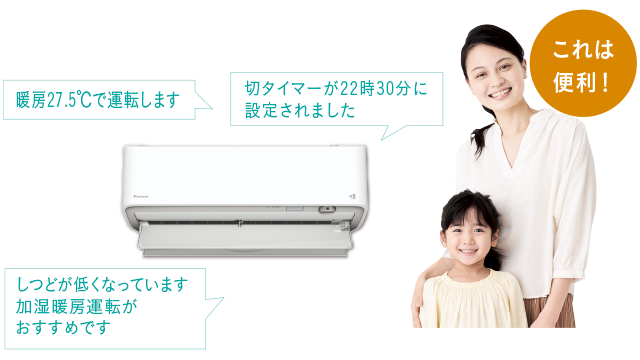 室内が高温または低温になりすぎるとエアコンのセンサーが検知して音声でお知らせ。さらに自動で冷房・暖房運転を行います。