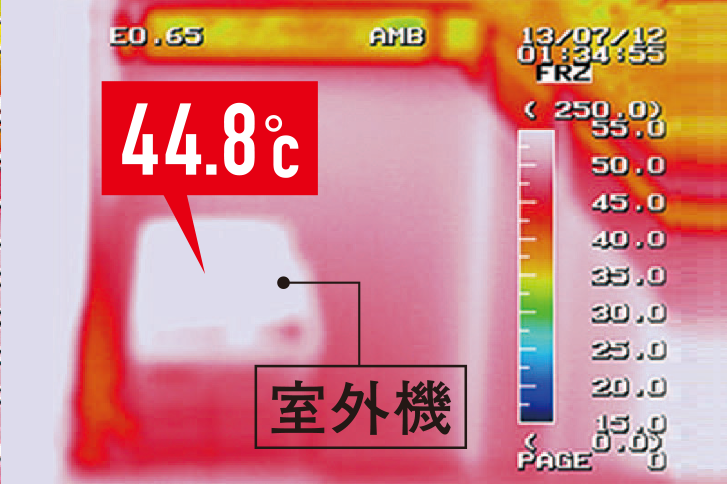 外気温34℃でも、狭小スペースの室外機周辺は高温になることがあります。