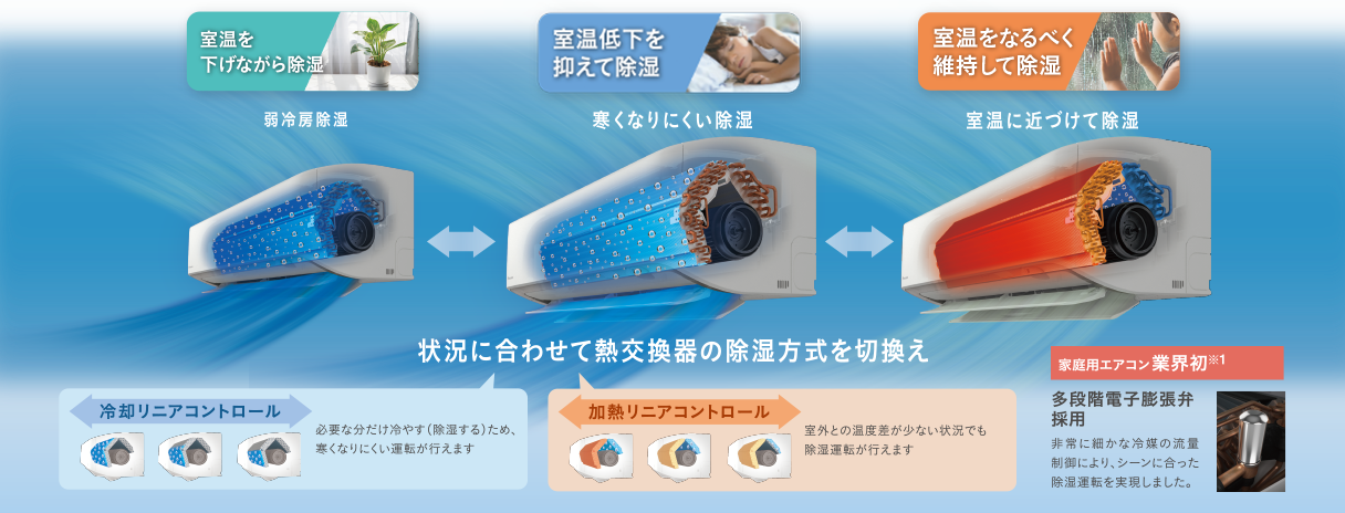 状況に合わせて除湿方式を切換え。熱交換器のリニアコントロールでシーンに合わせた除湿を行います。
