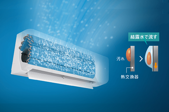 結露水を利用して、熱交換器の汚れを洗浄。