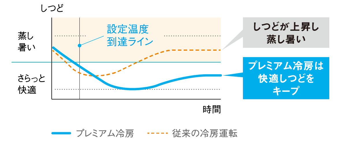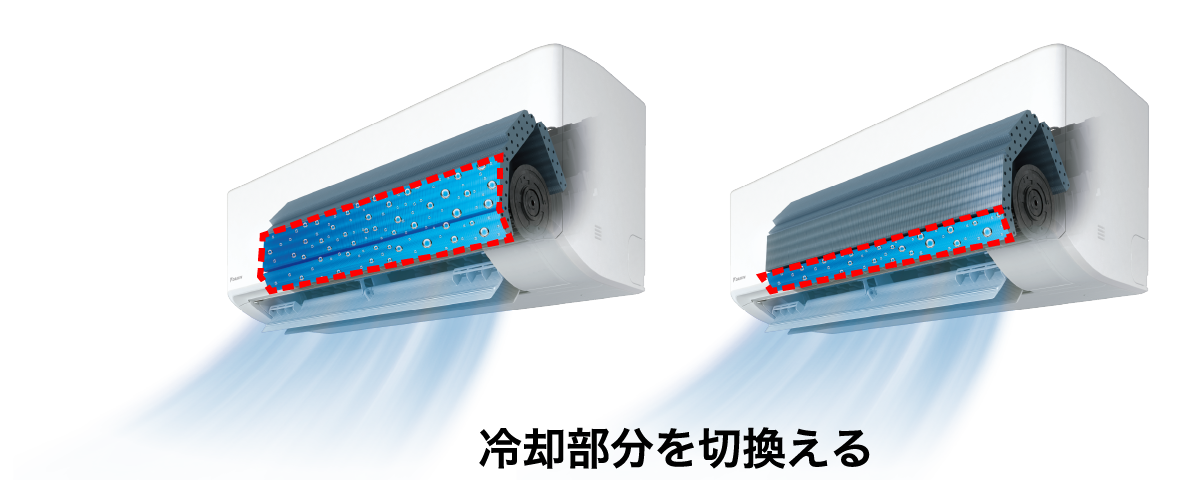 設定温度に達したあとも熱交換器の冷却部分を無段階に切換えて除湿を行い、蒸し暑さを感じにくい快適な冷房を実現。