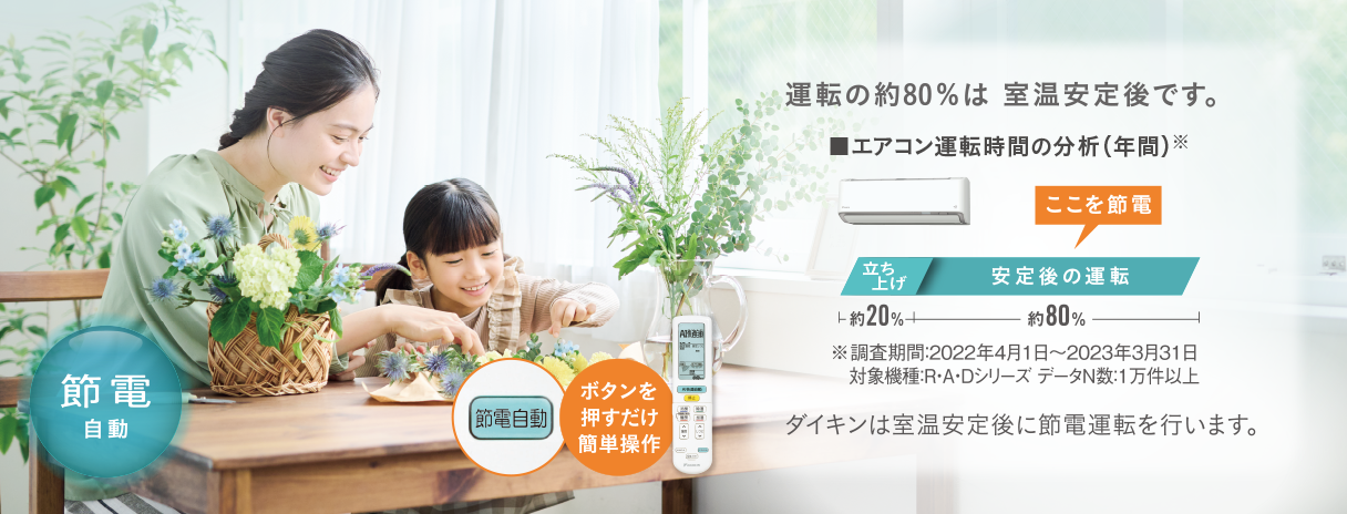 例えば、心地よく過ごしたい時は快適性優先の「AI快適・節電運転」で、消費電力が気になる時は「節電自動運転」で。ダイキンなら、シーンに合わせて2つの自動運転が選べます。