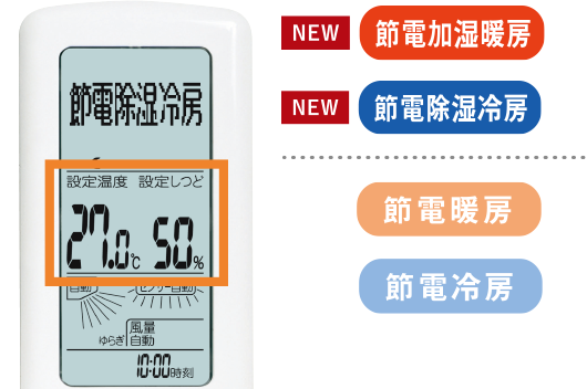 運転はじめはしっかりと空調を行い、室内が設定温度・しつどに到達し安定すると、消費電力を抑えて運転。温度に加えしつどもコントロールできるようになり、その時々の空調の必要能力に合わせてかしこく、無理をしすぎない節電運転を行います。