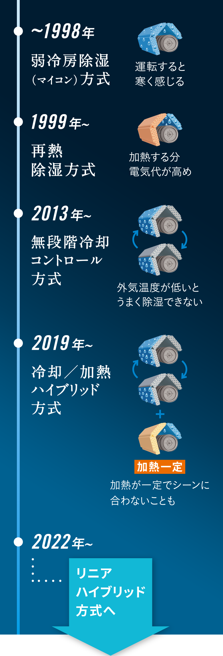 ●リニアハイブリッド方式は複数の除湿方式を切換えるため、一般社団法人 日本冷凍空調工業会による再熱除湿方式には該当しません。