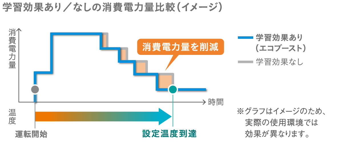 ※1. 当社測定基準による評価。当社環境試験室(14畳)において。測定機AN406ADPと同等機種(AN406ARP)において:学習あり、学習なしとの比較。【冷房時】測定条件:外気温35℃、設定温度27℃、風向3段階目、風量自動。設定温度に到達し運転が安定したときの消費電力量で比較。 試験結果:学習あり333Wh 学習なし351Wh【 暖房時】測定条件:外気温7℃、設定温度20℃、風向3段階目、風量自動。設定温度に到達し運転が安定したときの消費電力量で比較。 試験結果:学習あり492Wh 学習なし536Wh ●実使用環境により効果は異なります。