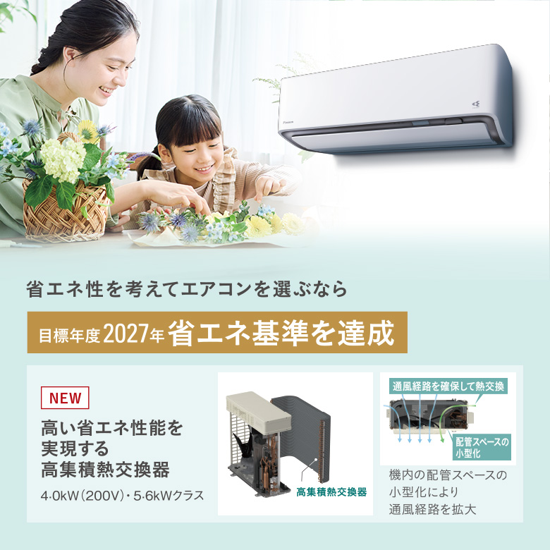 リビングや寝室、仕事部屋など、長時間エアコンを使用するなら省エネ性の高さがポイント。目標年度2027年省エネ基準達成モデルなら、高い省エネ性を発揮します。