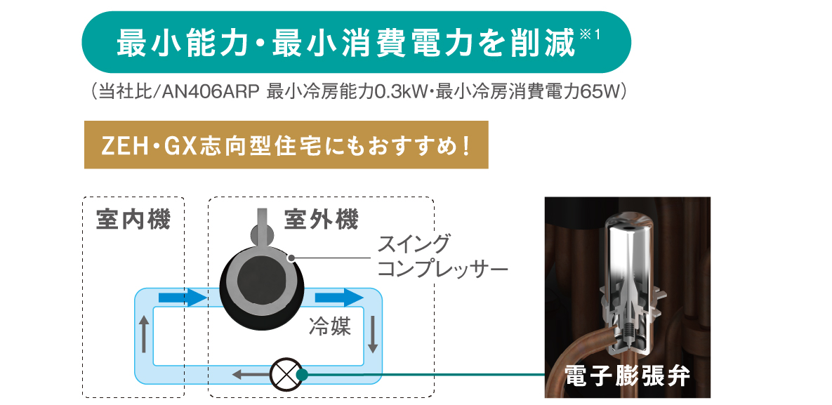 ※1. 新機種2026年AN406ARPと従来機種2025年AN405ARPとの比較。【最小冷房能力】新機種:0.3kW、従来機種:0.5kW 【最小冷房消費電力】新機種:65W、従来機種:85W