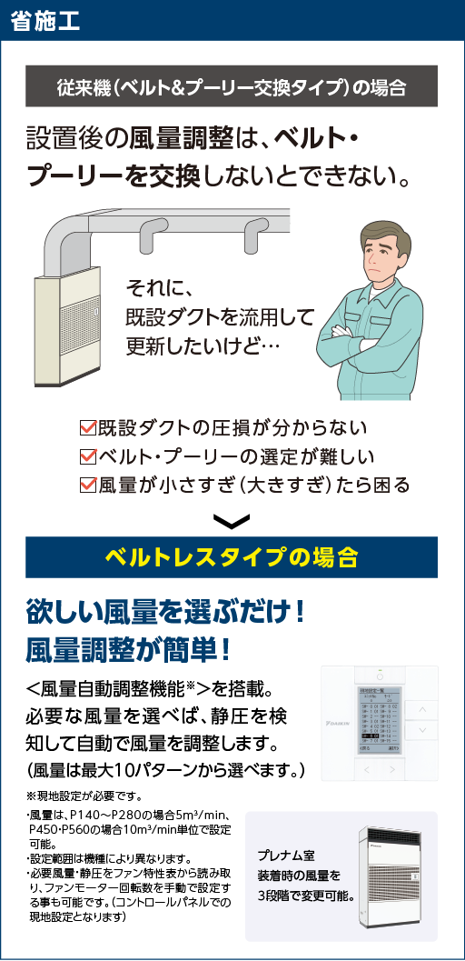 大容量DCモーターを採用し、従来機ではモーターサイズアップが必要だった範囲も、ベルトレスタイプでは標準での対応が可能です。 また、風量範囲を拡大したことで、従来同等機種より大きな風量を確保できます。