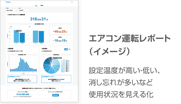 エアコンの運転時間帯や設定温度の状況がわかる運転レポートを毎月作成し、メールでお知らせします。