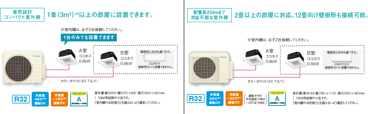 長尺配管20m(2室合計)(チャージレス15m☆) | 長尺配管50m(2室合計。1室当り30m以下。)(チャージレス30m☆) |