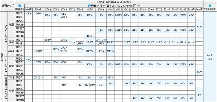 現在お使いの貯湯ユニットの機種名を下表で照合し、交換用ヒートポンプユニットと接続可能かご確認ください。