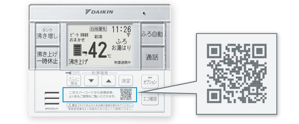 二次元コードで故障診断や、よくあるご質問をスマートフォンですぐに確認できるので、急なお困りごとの際も安心です。