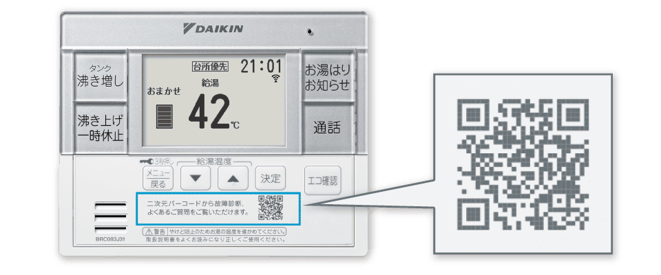 二次元コードで故障診断や、よくあるご質問をスマートフォンですぐに確認できるので、急なお困りごとの際も安心です。