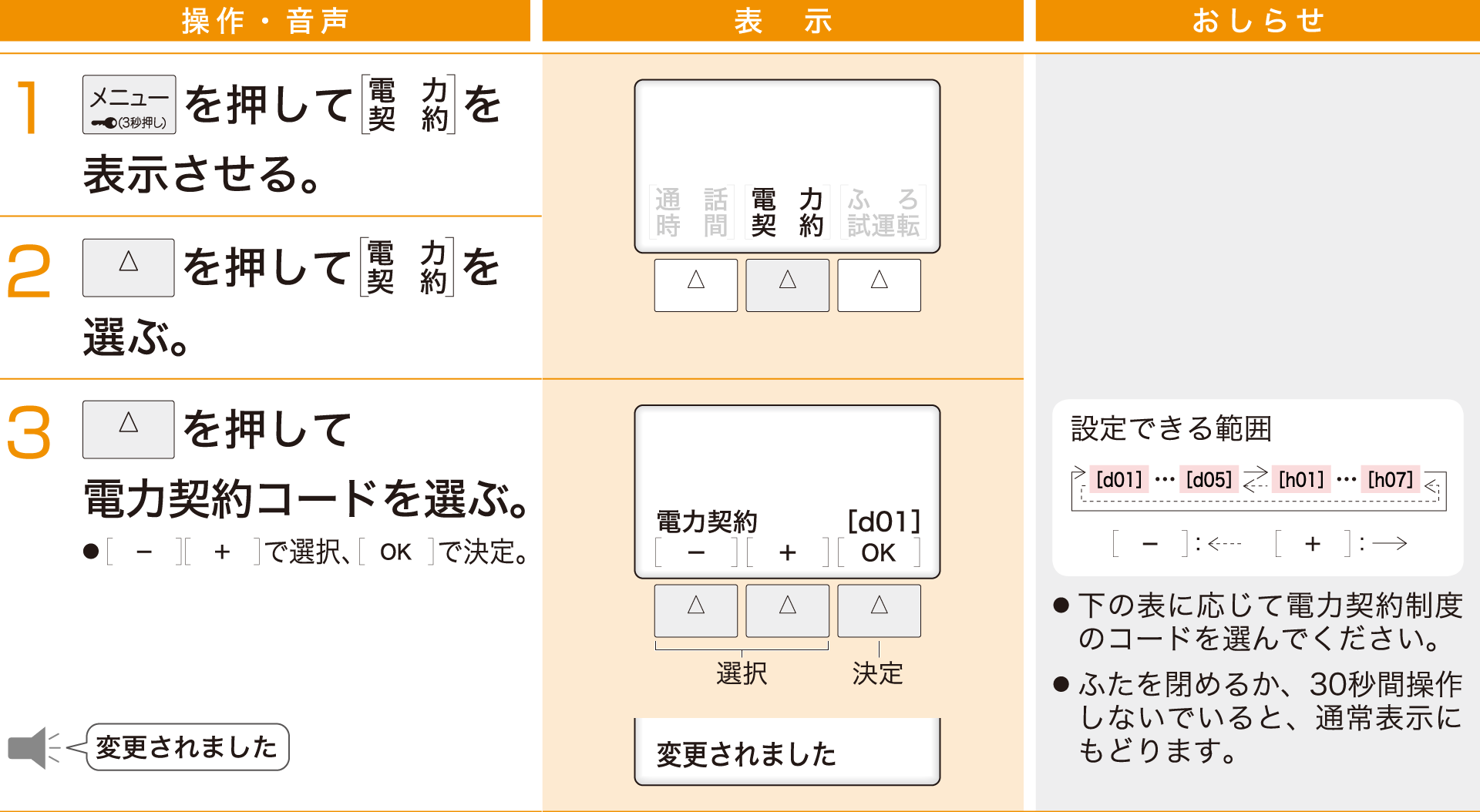 2016年4月から始まりました電力自由化に伴い、各電力会社様より新規の電力契約プランが新設されておりますが、弊社エコキュート及びネオキュートの現行機種での対応方法について、推奨する電力契約設定のご案内を申し上げます。下記《電⼒契約プランの設定手順について》の手順例を参考に、機種分類表と推奨する電力契約設定の対応表から推奨する電力契約設定を確認したのち、設定方法に従って設定してください。