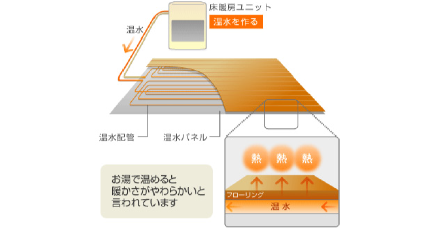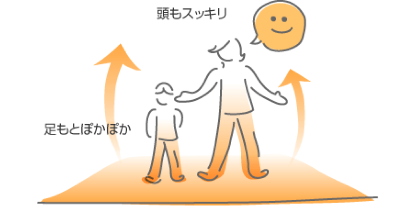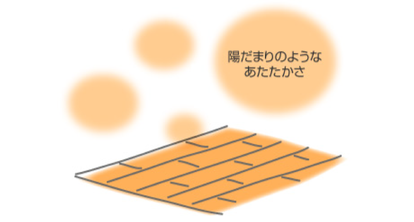 床暖房は、床から直に伝わる熱と、室内を下からあたためる熱との組み合わせ。だから、足元はぽかぽか、背中もあったか。でも上に行くにしたがってやわらぐので、頭はスッキリ。体にやさしいあたたかさです。