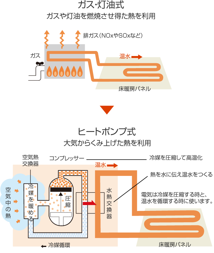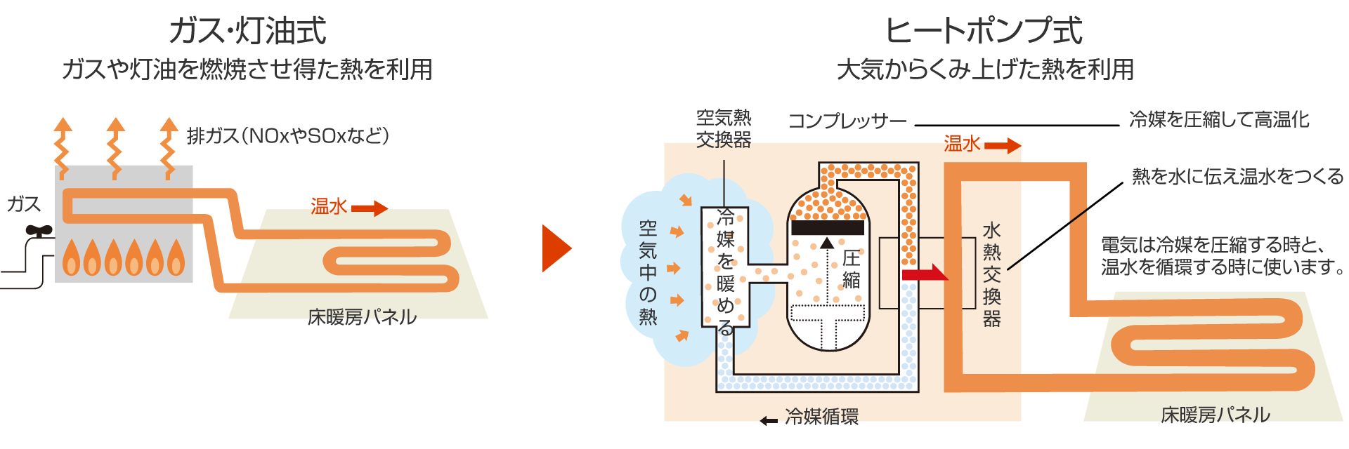 灯油式やガス式の床暖房を省エネ性や経済性の高い、ヒートポンプ式温水床暖房に入れ替えたい。