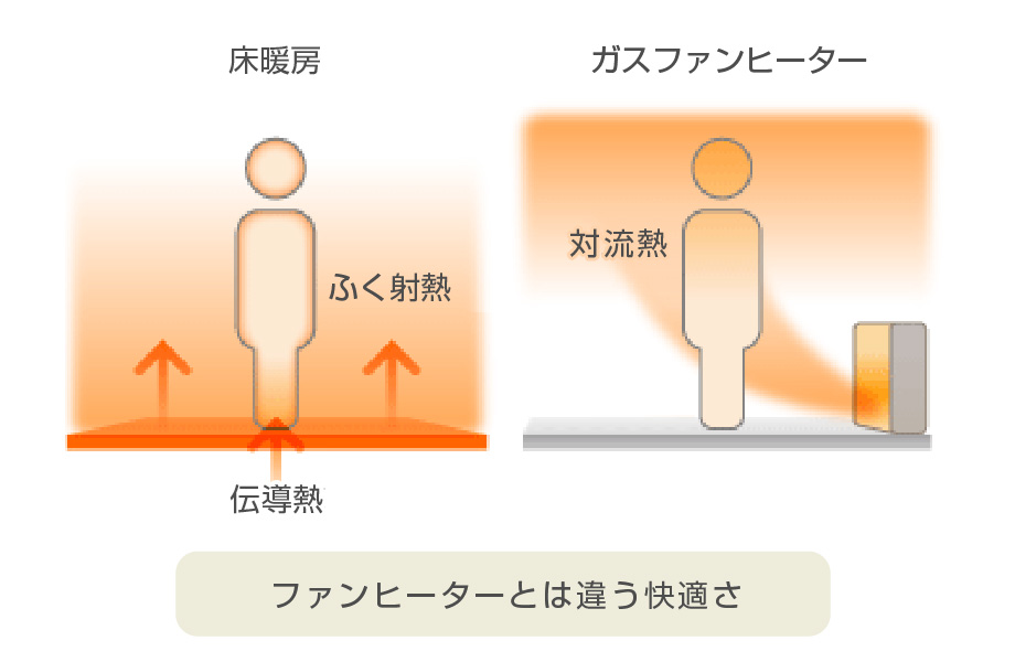 床暖房は、床から直接伝わる熱(伝道熱)と床から部屋全体に広がる熱(ふく射熱)の組み合わせであたためます。