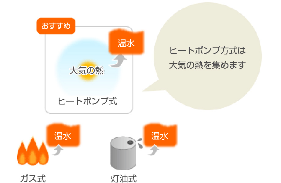 大気の熱をくみ上げ、温水を作るのが、ヒートポンプ方式です。