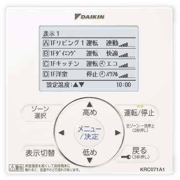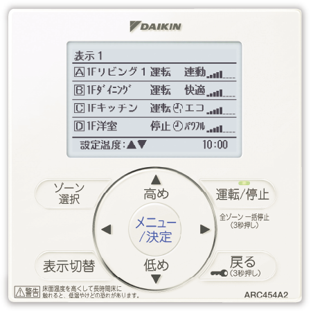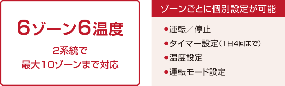 リモコン1台で、最大6ゾーンをまとめて一元管理。温度設定がゾーンごとにきめ細かくコントロールでき、日当たりの違いや、1階と2階など、異なる条件に合わせた設定が可能です。