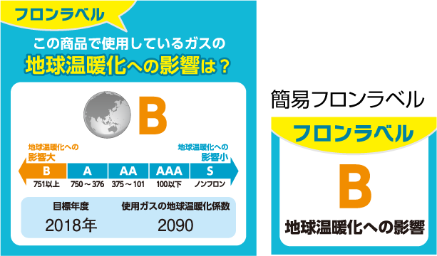 このラベルはフロン排出抑制法に基づく指定製品の環境影響度として用いられている地球温暖化係数(GWP)について、定められた目標への達成度を表したものです。製品を選択する時の参考にしてください。家庭用エアコンは、出荷台数で加重平均した環境影響度として用いられている地球温暖化係数(GWP)の値が、目標年度(2018年度)において目標値(750)を上回らないことが、製造事業者等に義務付けられております。