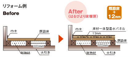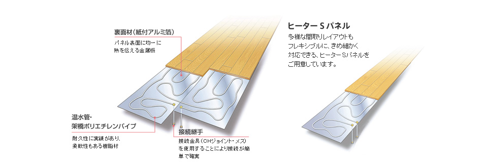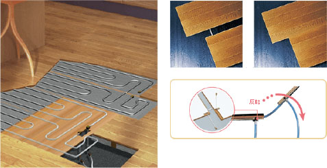 取り付けが簡単なユニット式床暖房パネルを採用。床材一体型のため、フローリングと発熱部の施工が同時に行えます。12mm厚と薄型で、リモデルや増改築の際、既存の床の上にも施工可能です。
