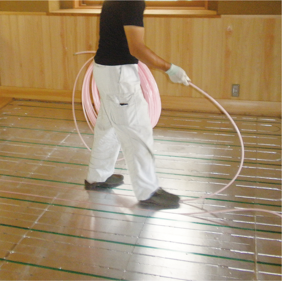 直線部の温水パネルは発砲ポリスチレンとアルミ箔がベースなので現地で切断が可能です。